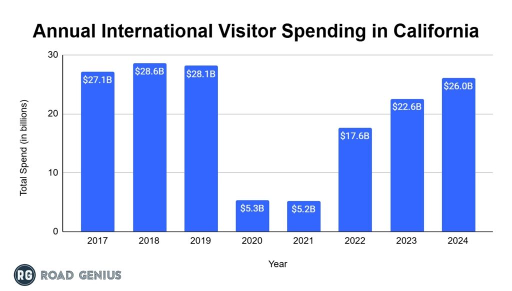In 2024, international tourists visiting California spent about $26.04 billion.