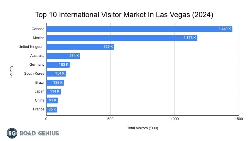 - Visitors to Las Vegas mainly came from Canada (1.45 million arrivals), Mexico (1.18 million arrivals), the United Kingdom (529,200 arrivals), Australia (264,300 arrivals), and Germany (182,500 arrivals).3