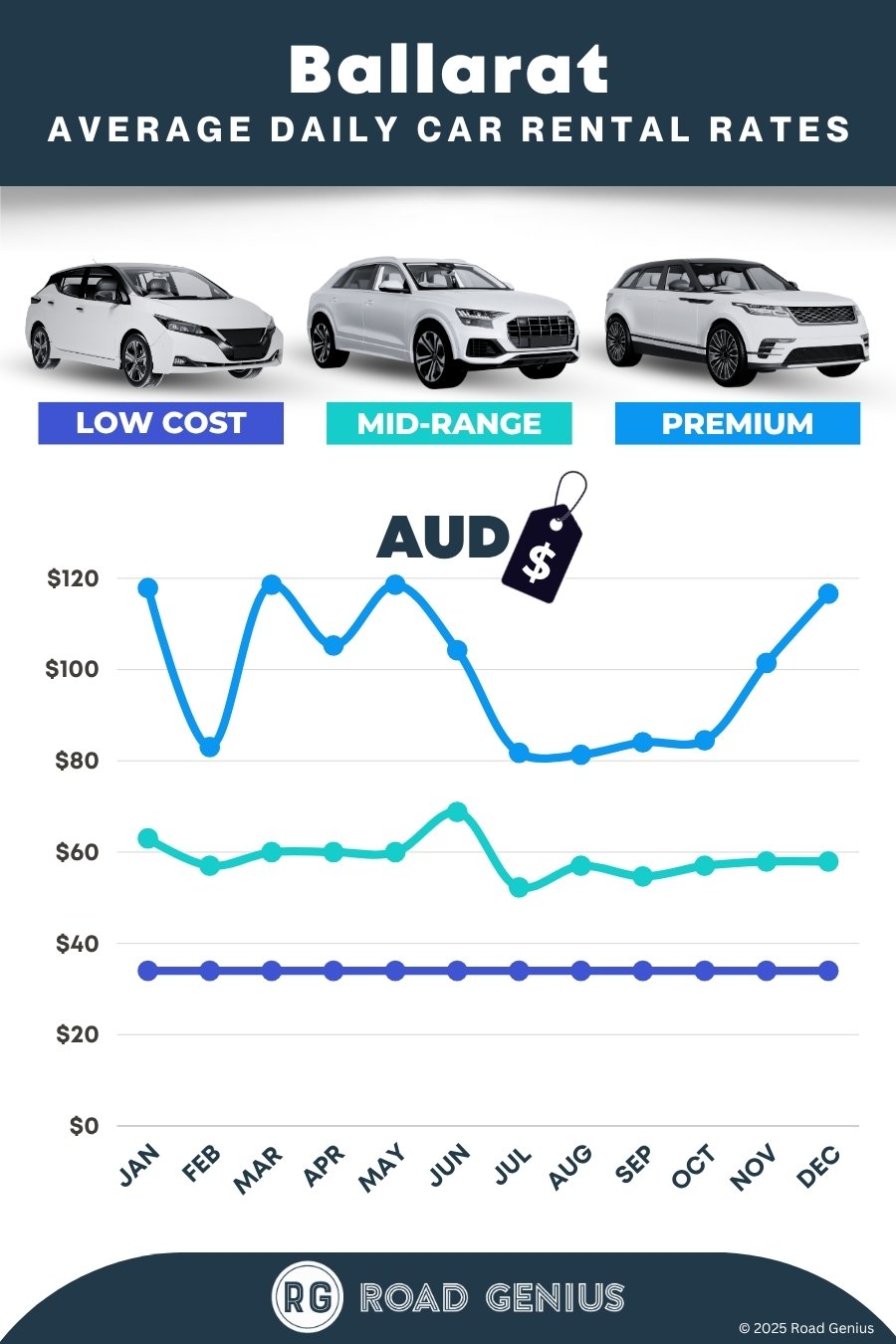 On average, car rentals in Ballarat cost around AUD $85.21 per day, with the lowest-priced rentals available from AUD $34.00 per day.