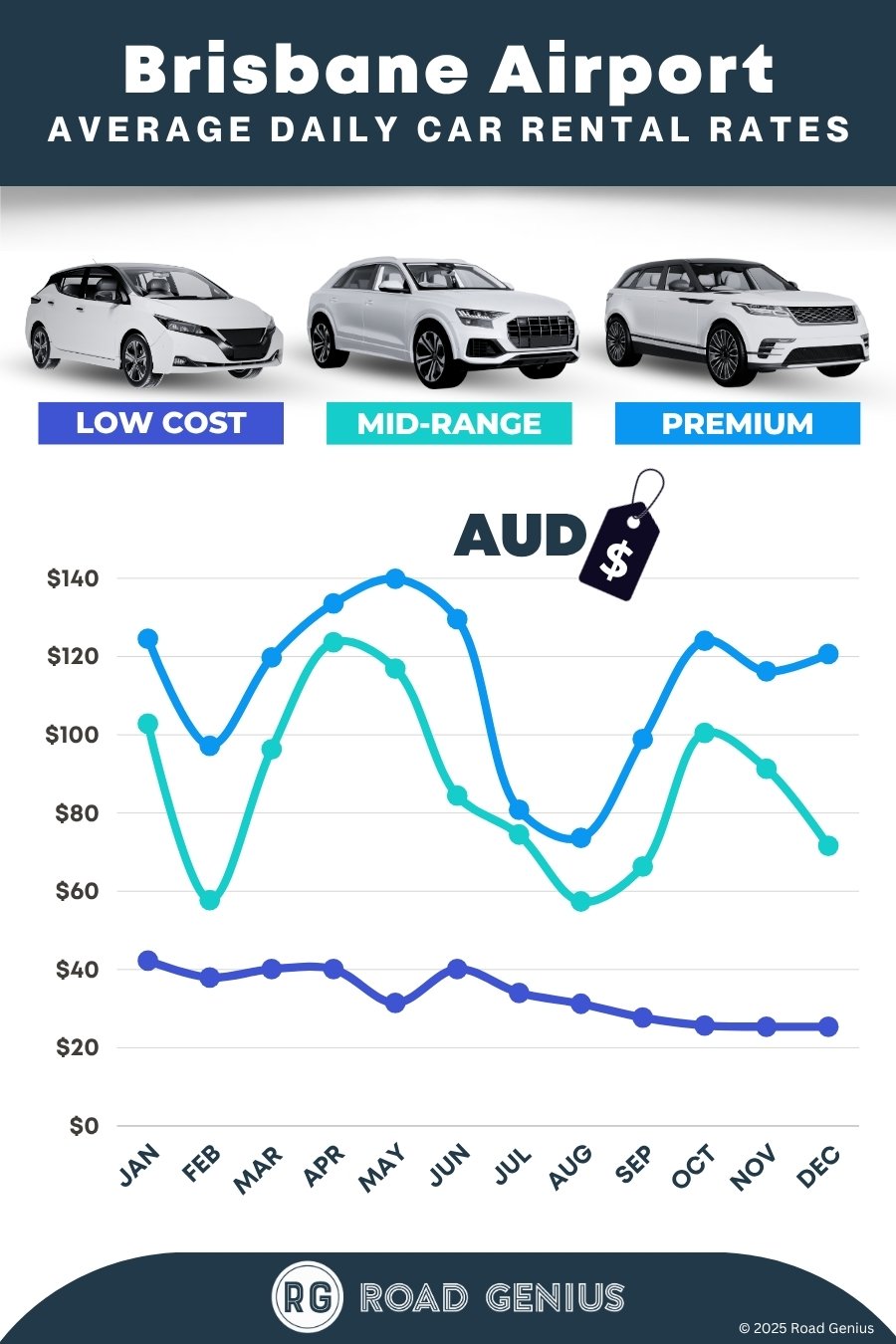 On average, car rentals in Brisbane Airport (BNE) cost around AUD $103 per day, with the lowest-priced rentals available from AUD $25 per day.