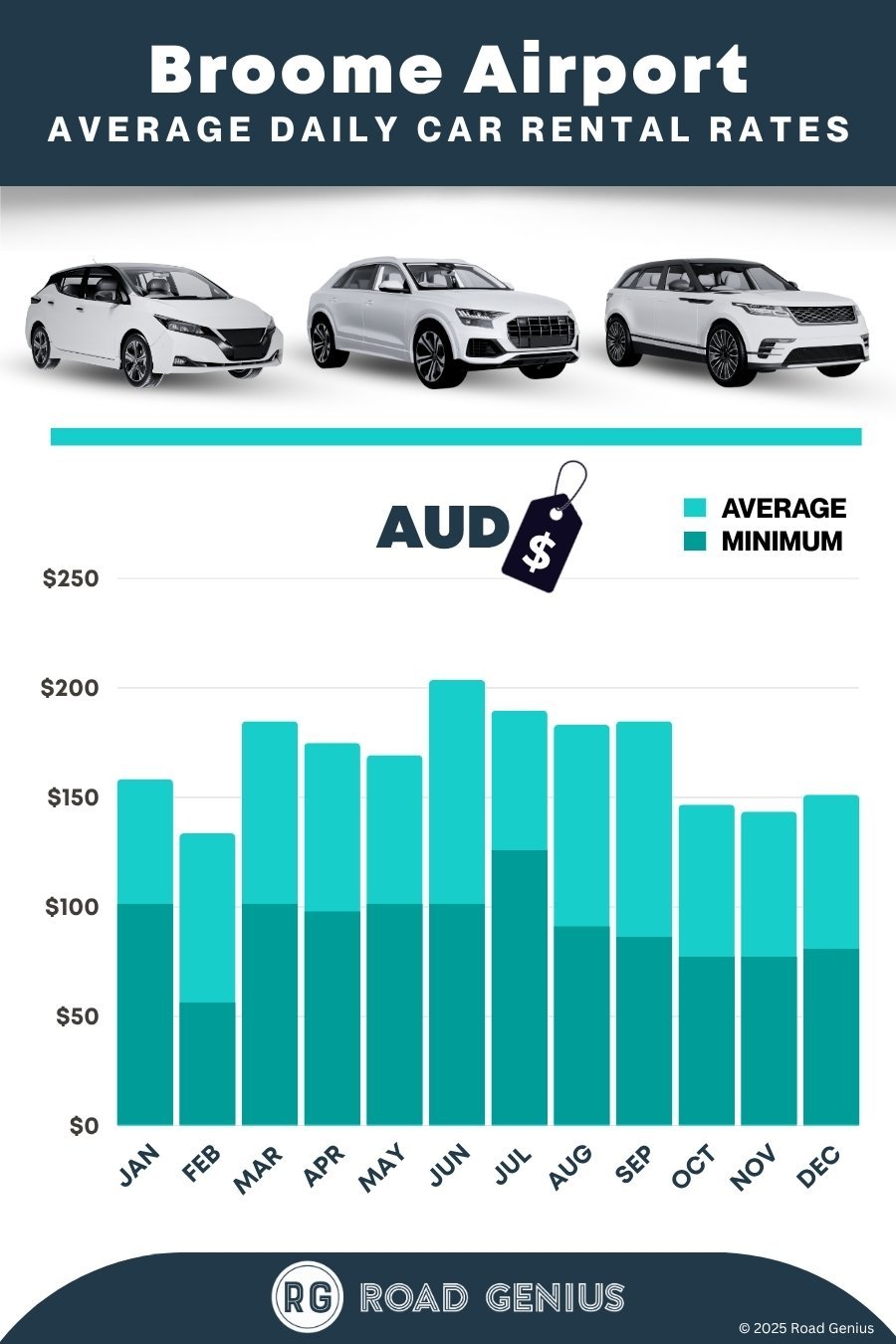 On average, car rentals at Broome Airport (BME) cost around AUD $163.97 per day, with the lowest-priced rentals available from AUD $55.97 per day.