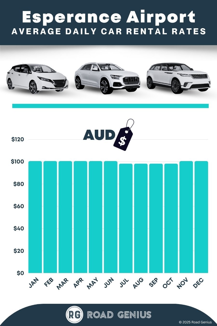 On average, car rentals at Esperance Airport (EPR) cost around AUD $99.42 per day, with the lowest-priced rentals available from AUD $96.06 per day.