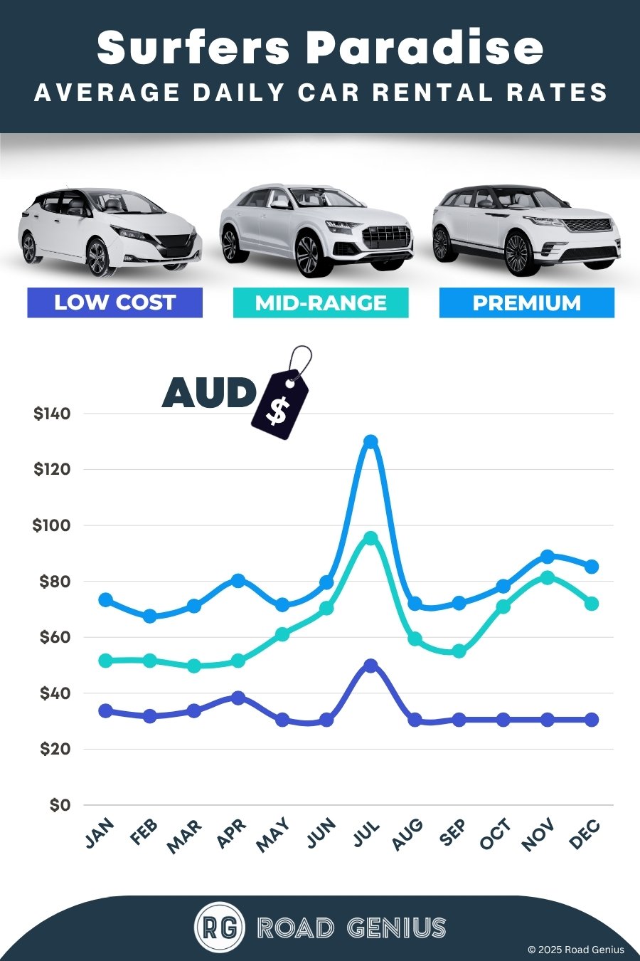 On average, car rentals in Gold Coast – Surfers Paradise cost around AUD $73.68 per day, with the lowest-priced rentals available from AUD $30.53 per day.