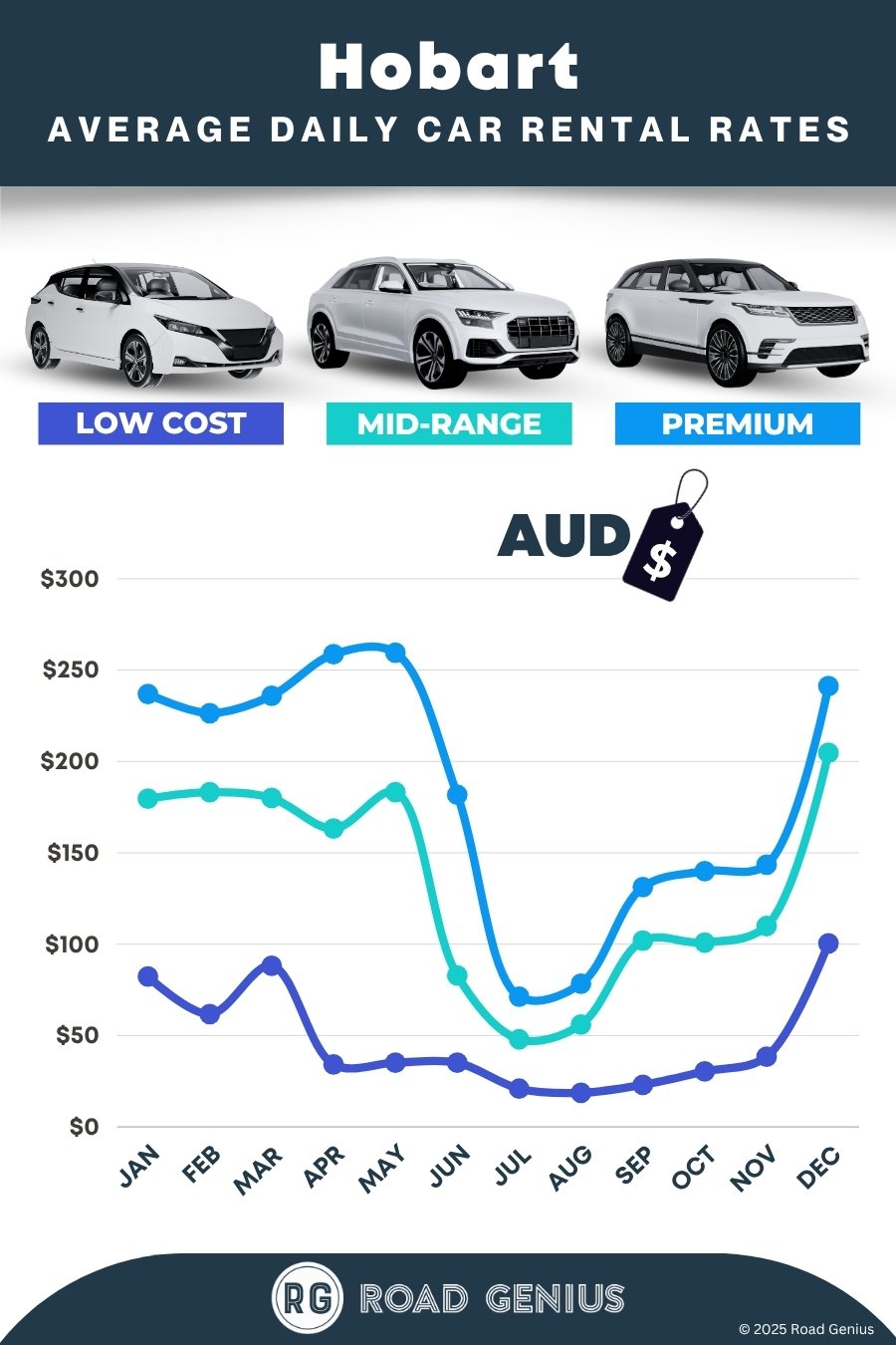 On average, car rentals in Hobart cost around AUD $157.04 per day, with the lowest-priced rentals available from AUD $18.61 per day.