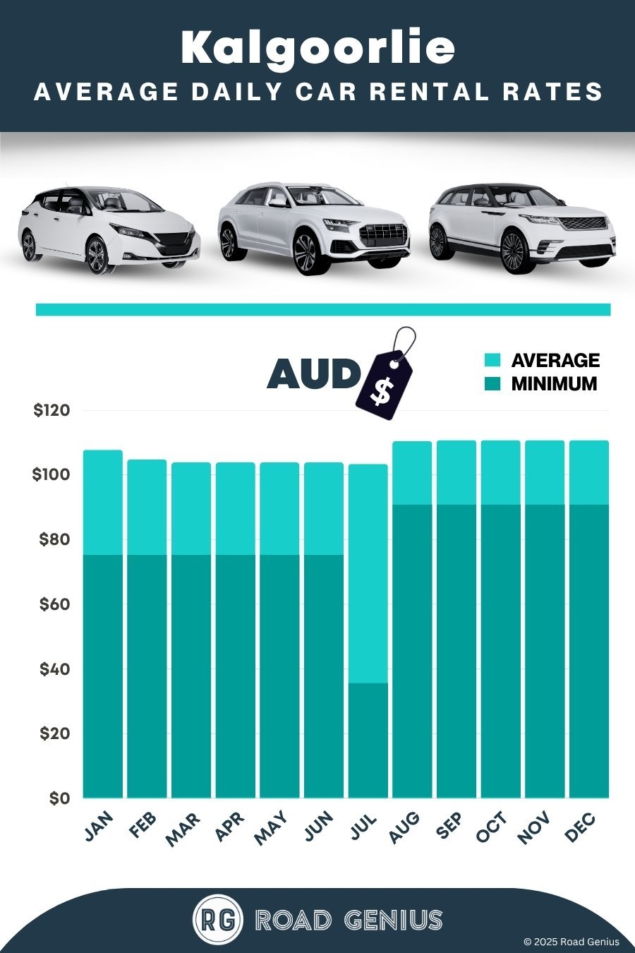 On average, car rentals in Kalgoorlie cost around AUD $110.33 per day, with the lowest-priced rentals available from AUD $75.00 per day.