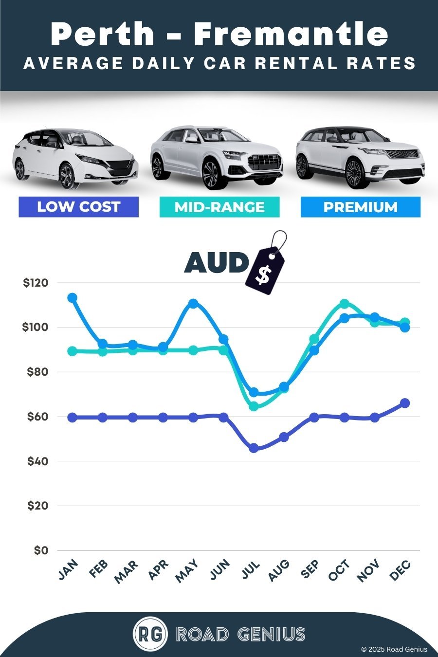 On average, car rentals in Perth – Fremantle cost around AUD $98.50 per day, with the lowest-priced rentals available from AUD $43.44 per day.