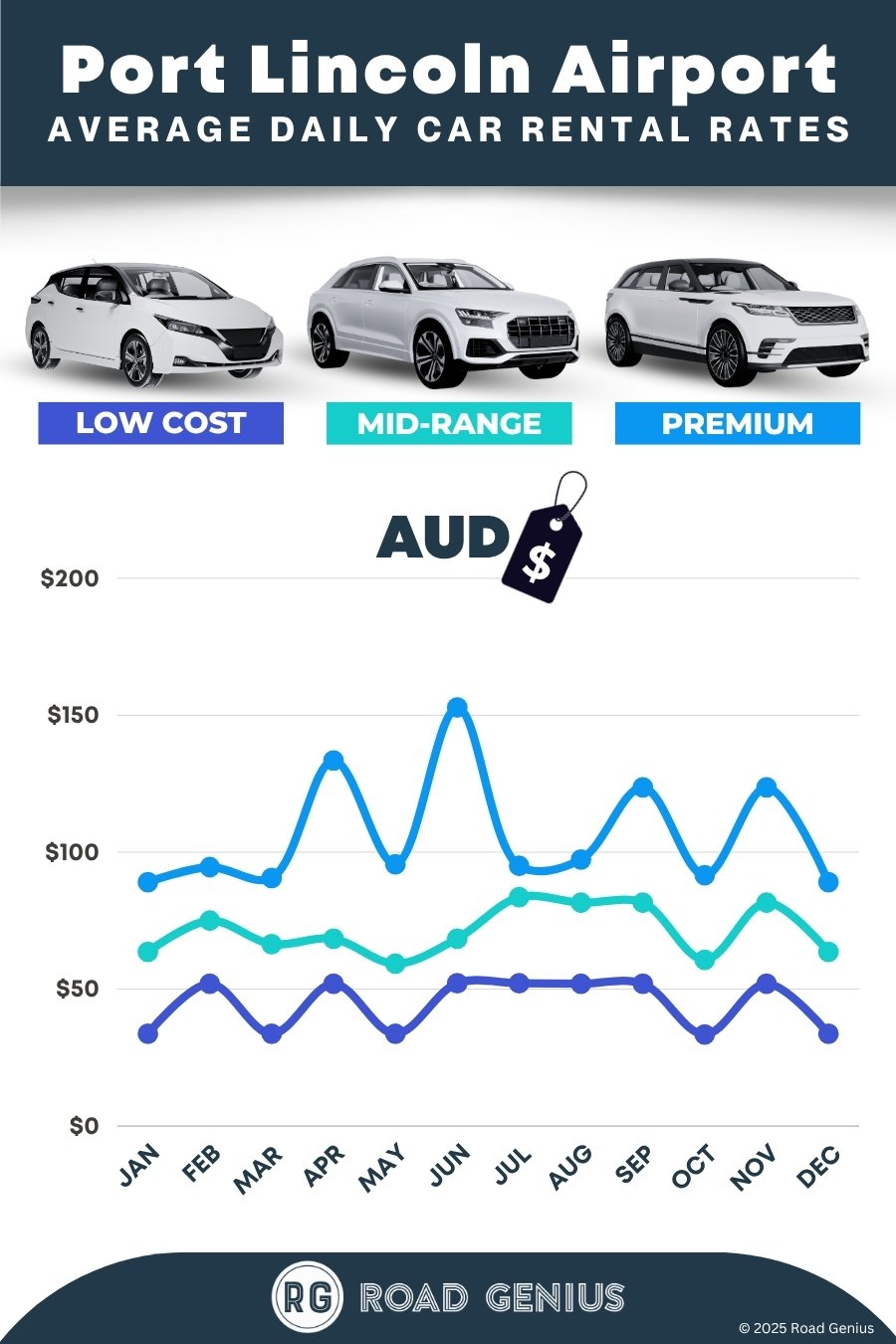 On average, car rentals at Port Lincoln Airport (PIO) cost around AUD $88.92 per day, with the lowest-priced rentals available from AUD $33.44 per day.