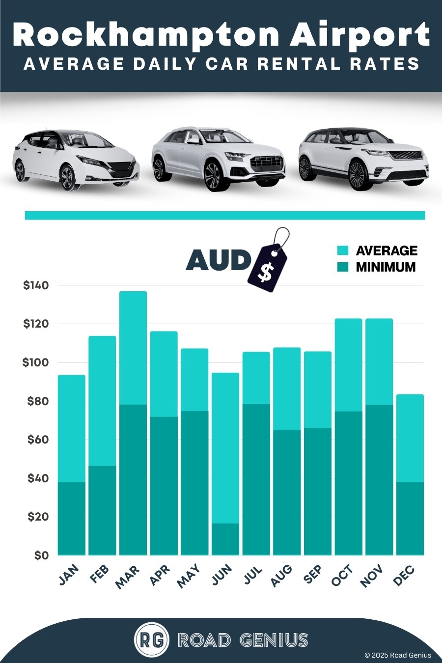 On average, car rentals at Rockhampton Airport (ROK) cost around AUD $127.67 per day, with the lowest-priced rentals available from AUD $16.37 per day.