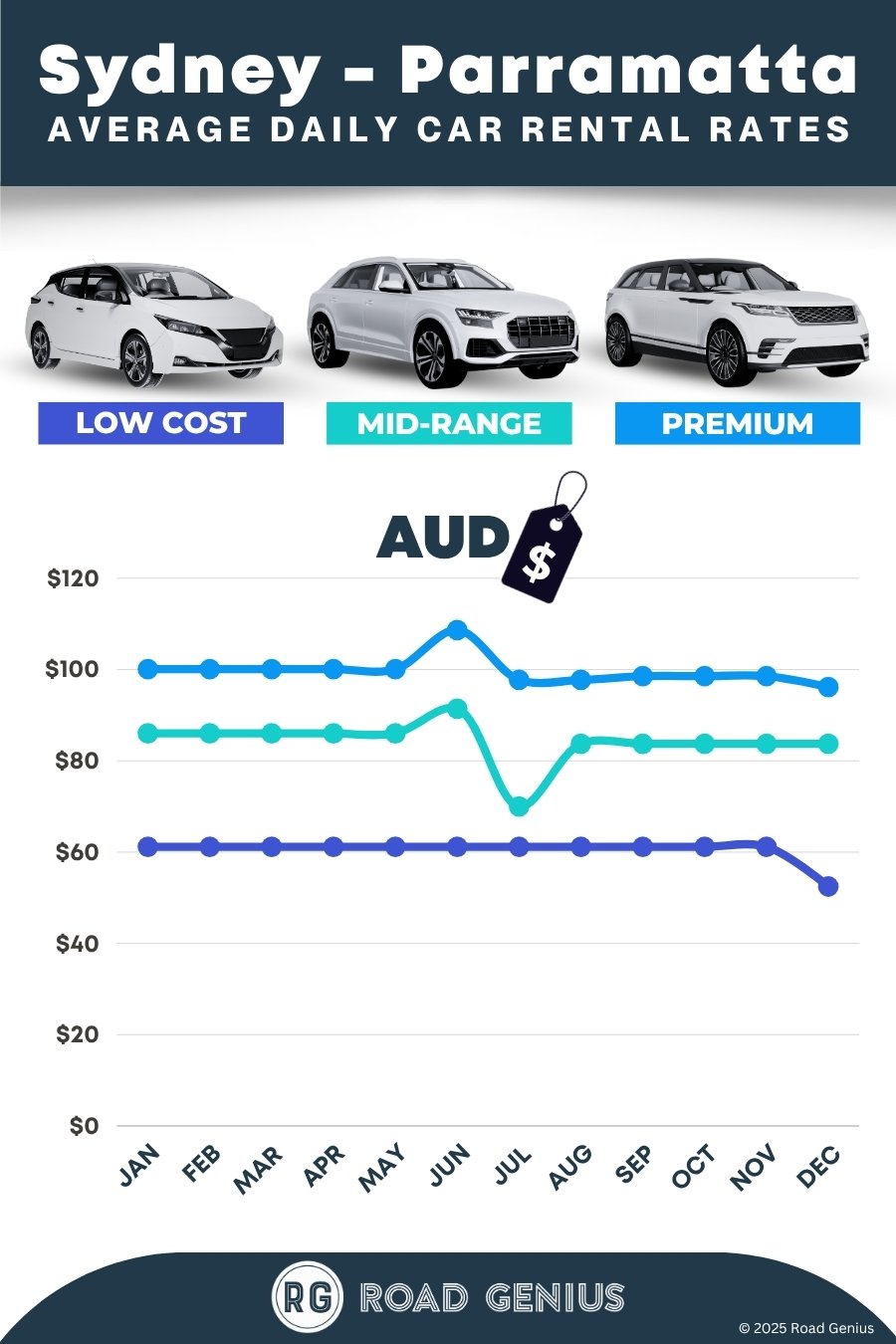 On average, car rentals in Sydney – Parramatta cost around AUD $91.23 per day, with the lowest-priced rentals available from AUD $52.46 per day.