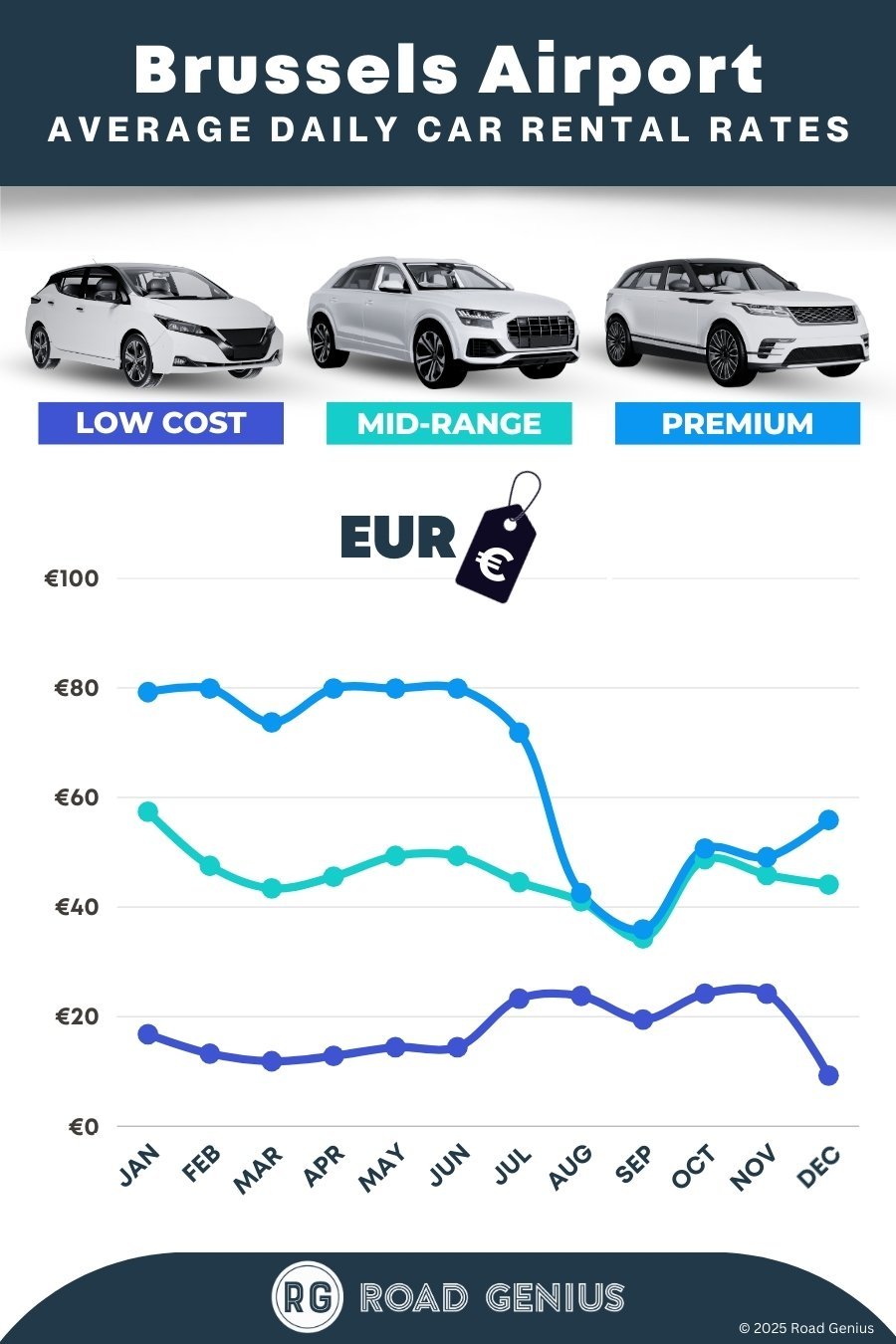 On average, car rentals at Brussels Airport cost around €43 per day, with the lowest-priced rentals available from €9 per day.