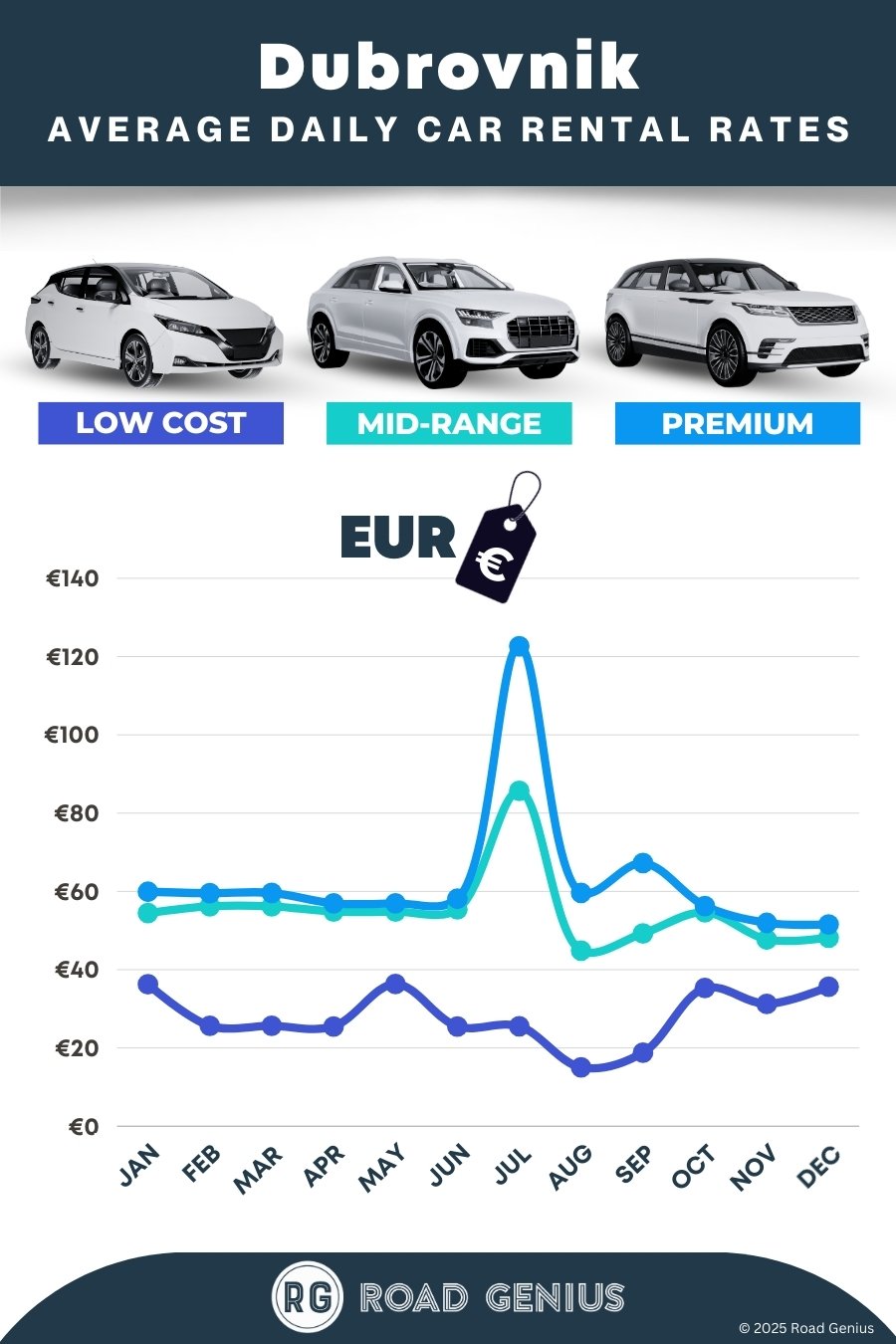On average, car rentals in Dubrovnik cost around €49 per day, with the lowest-priced rentals available from €15 per day.
