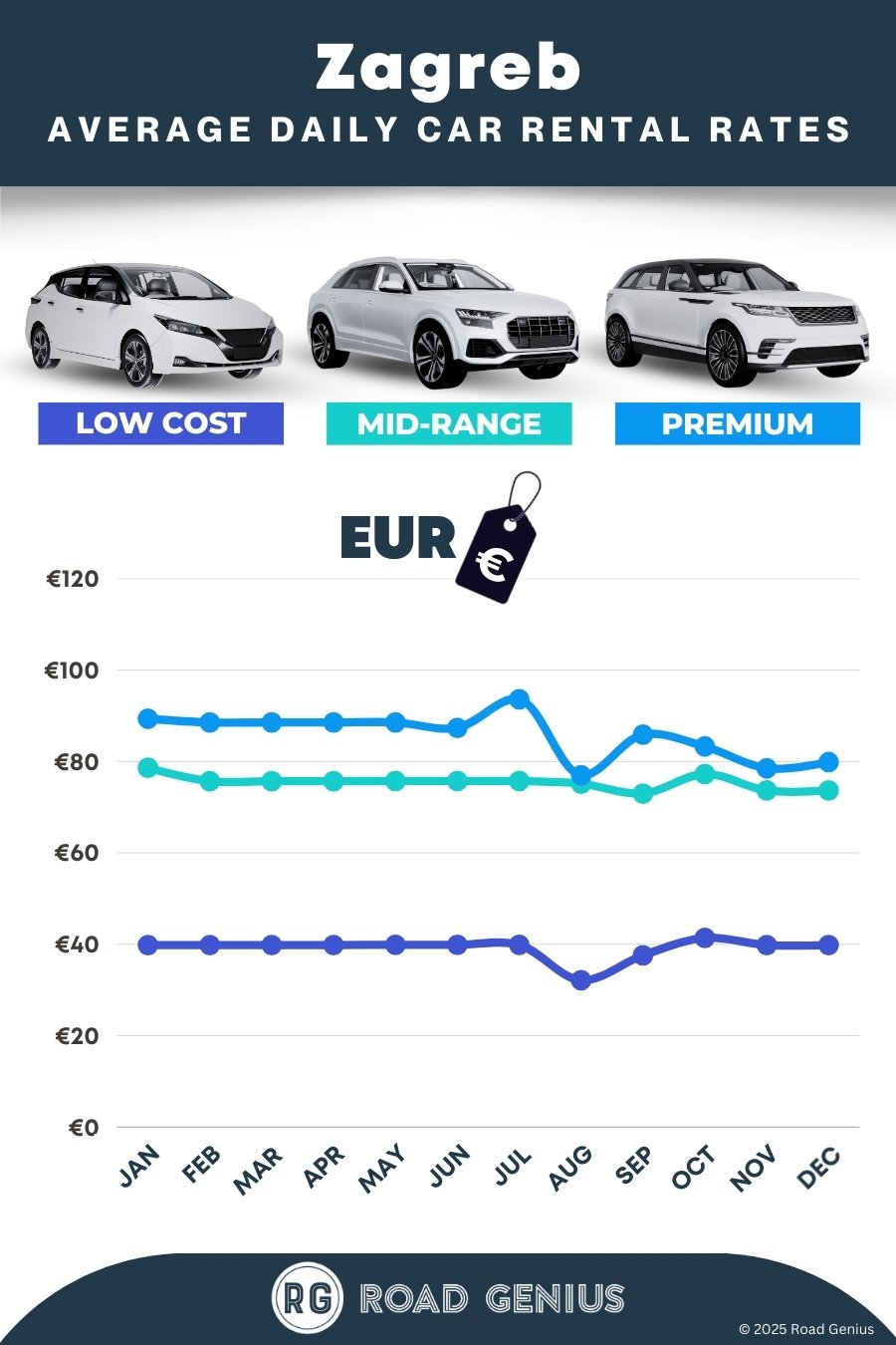 On average, car rentals in Zagreb cost around €67 per day, with the lowest-priced rentals available from €32 per day.