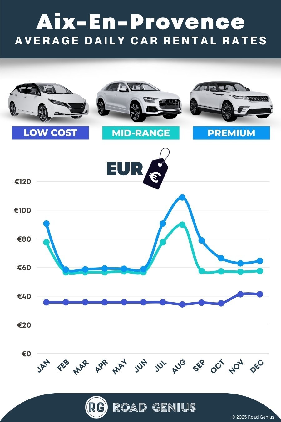 On average, car rentals in Aix-en-Provence cost around €57 per day, with the lowest-priced rentals available from €34 per day.