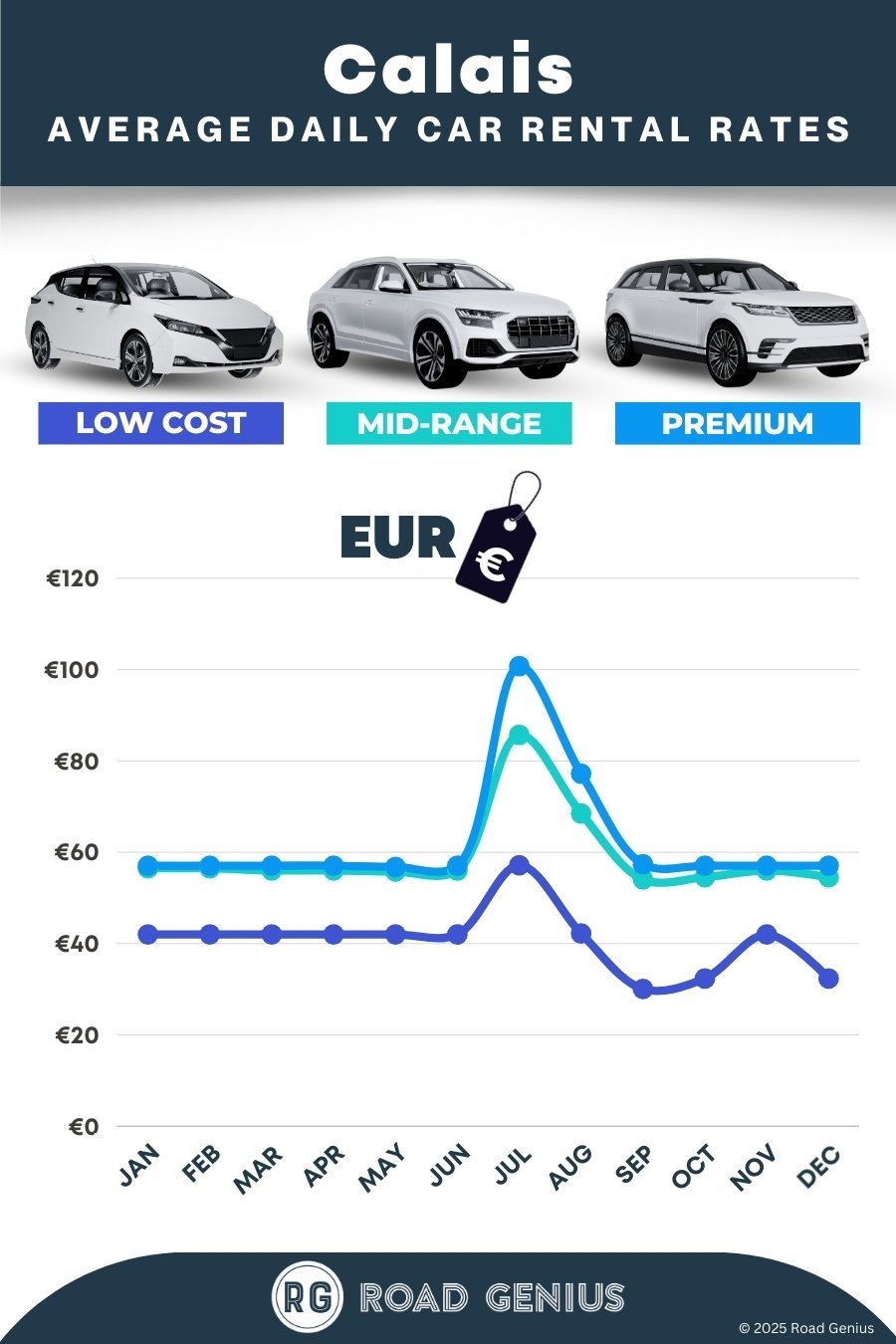 Compare pickup spots in Calais: Town branches often price lower than the ferry terminal or Eurotunnel Coquelles. Add the short taxi from the port to your total and pick the cheapest combo.