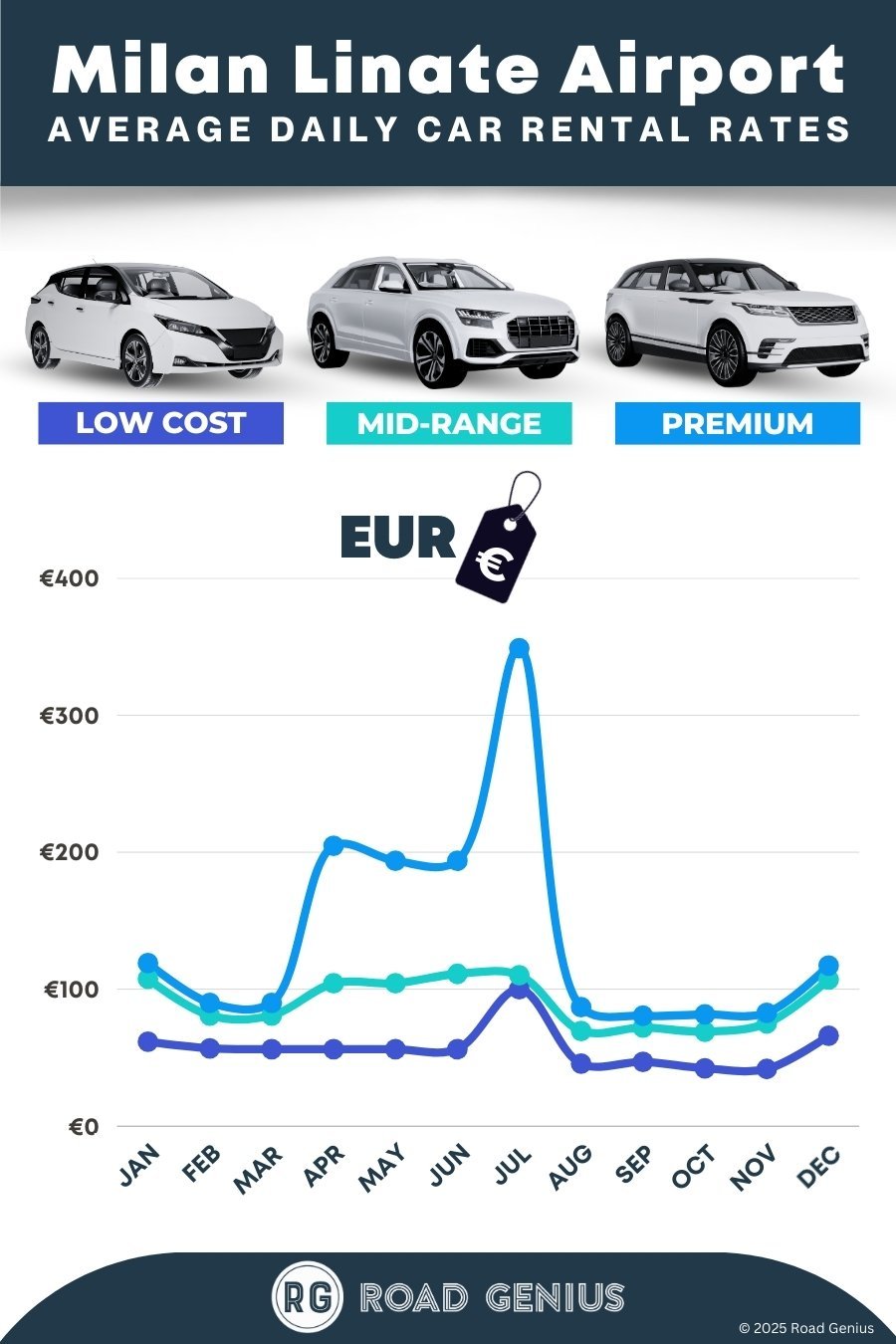 On average, car rentals at Milan Linate Airport cost around €96 per day, with the lowest-priced rentals available from €42 per day.