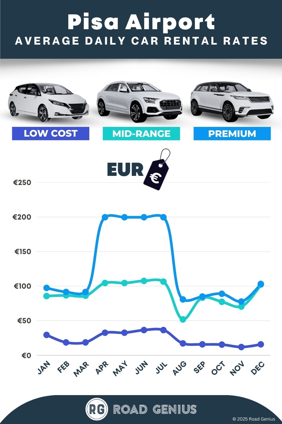 On average, car rentals at Pisa Airport cost around €80 per day, with the lowest-priced rentals available from €12 per day.