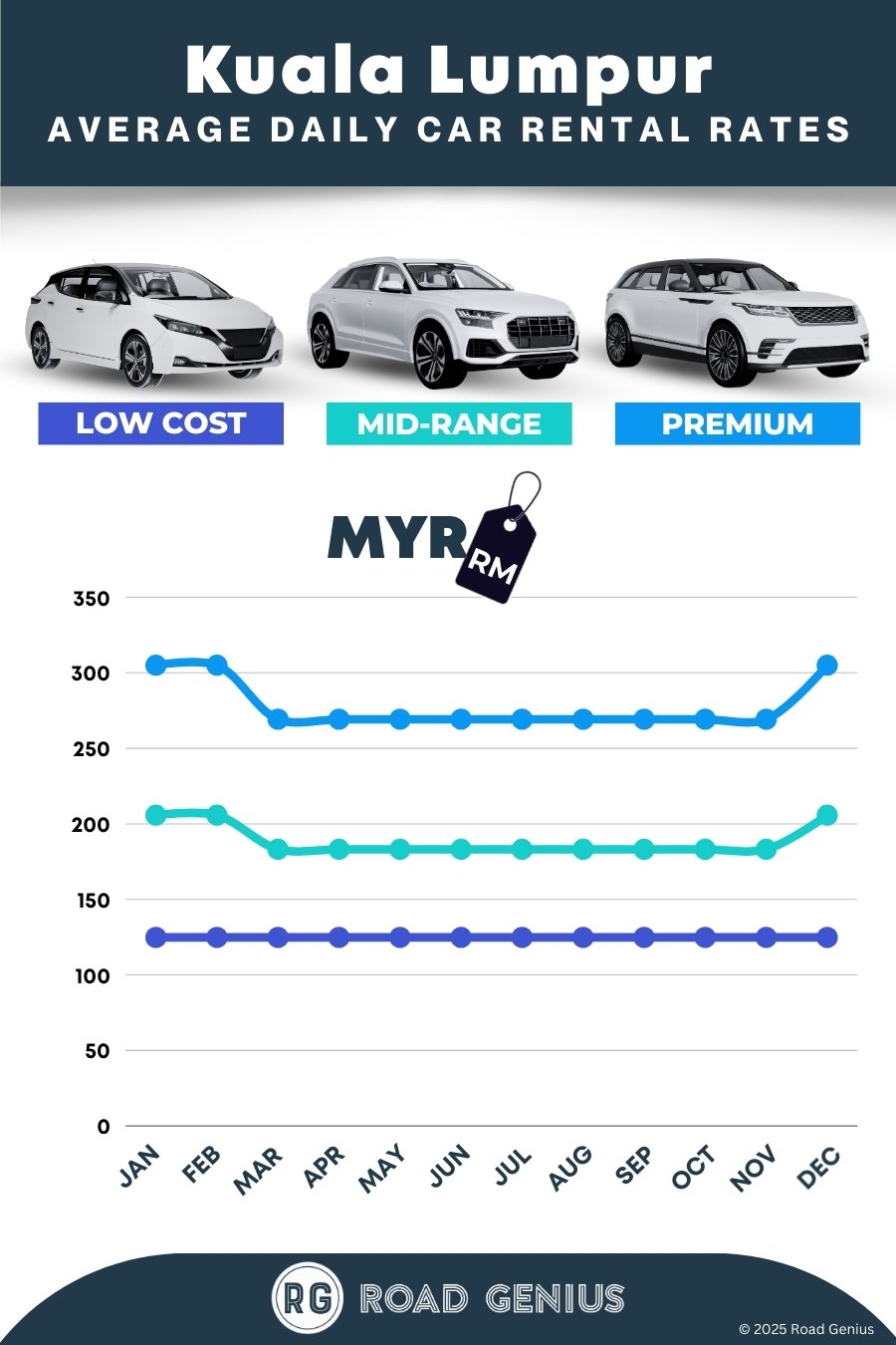 On average, car rentals in Kuala Lumpur cost around 276 MYR per day, with the lowest-priced rentals available from 125 MYR per day.