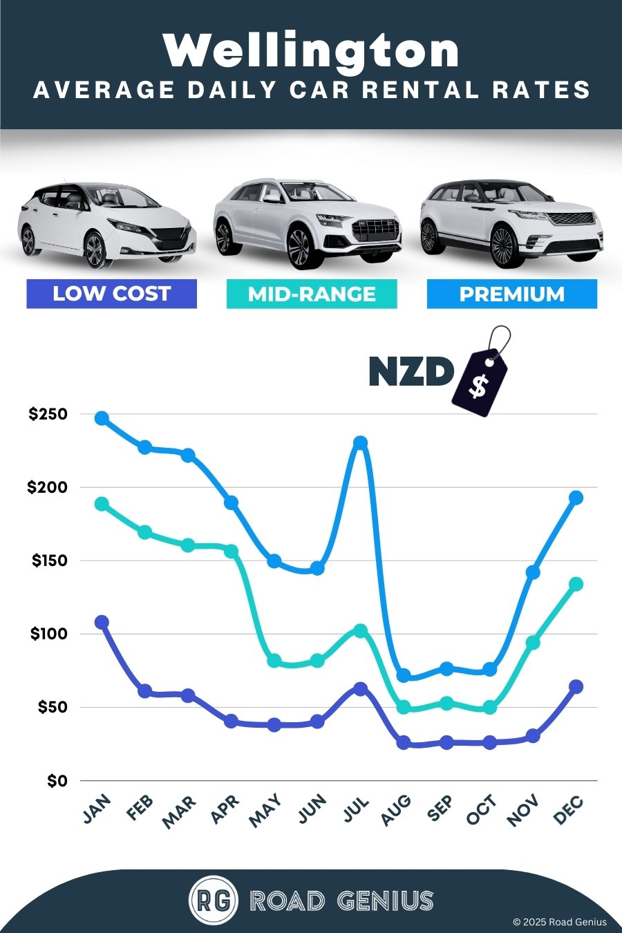 On average, car rentals in Wellington cost around NZD $108 per day, with the lowest-priced rentals available from NZD $26 per day.