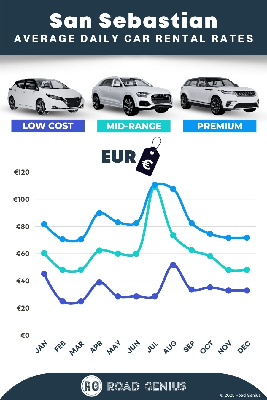 On average, car rentals in San Sebastian cost around €59 per day, with the lowest-priced rentals available from €25 per day.
