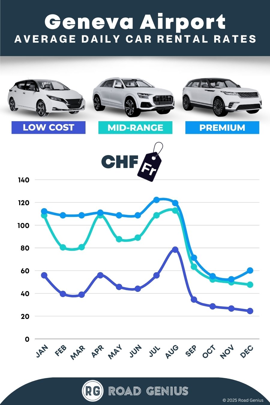 On average, car rentals at Geneva Airport cost around CHF 74 per day, with the lowest-priced rentals available from CHF 25 per day.