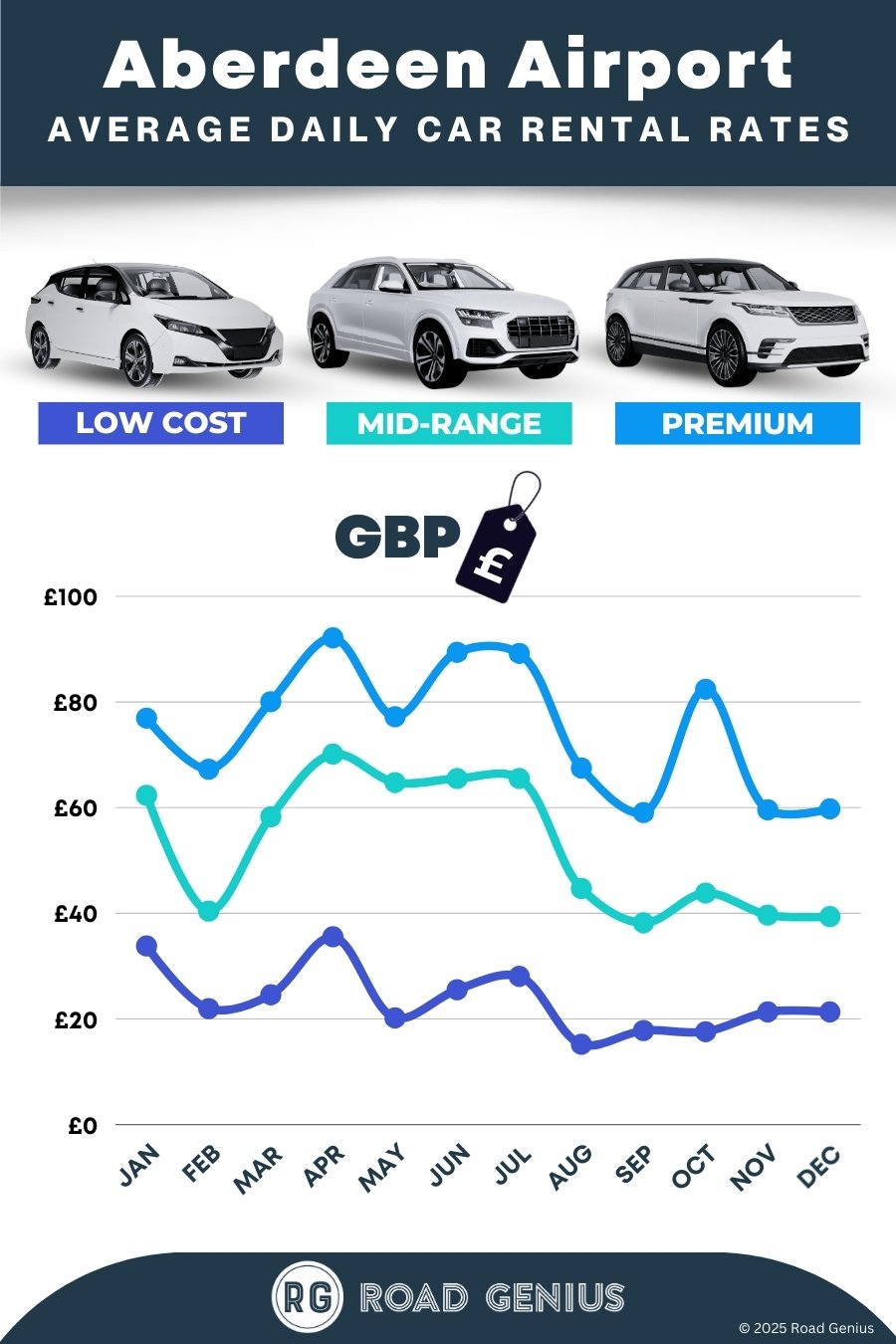 On average, car rentals at Aberdeen Airport cost around €50 per day, with the lowest-priced rentals available from €15 per day.
