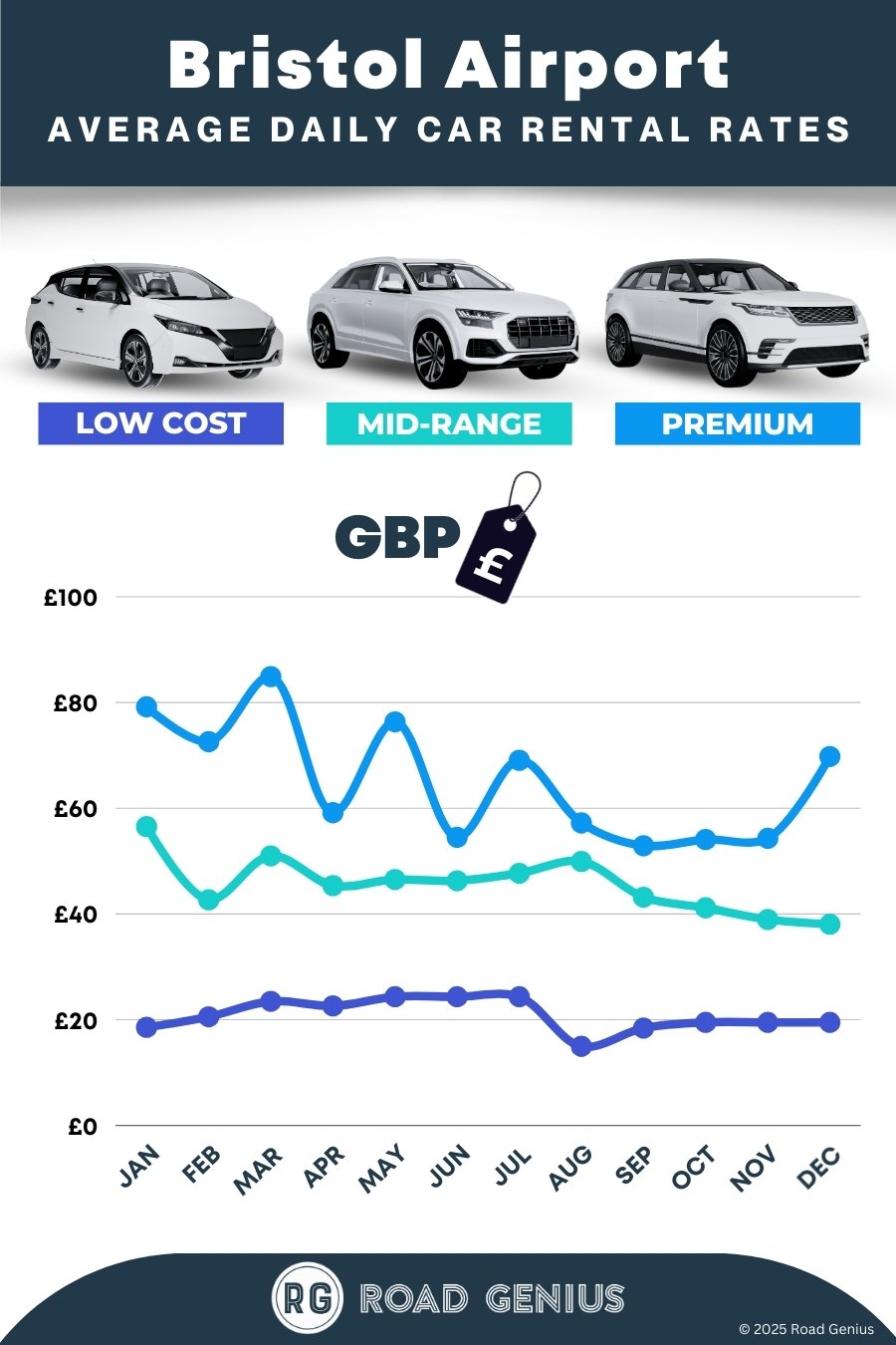 On average, car rentals at Bristol Airport cost around €44 per day, with the lowest-priced rentals available from €15 per day.