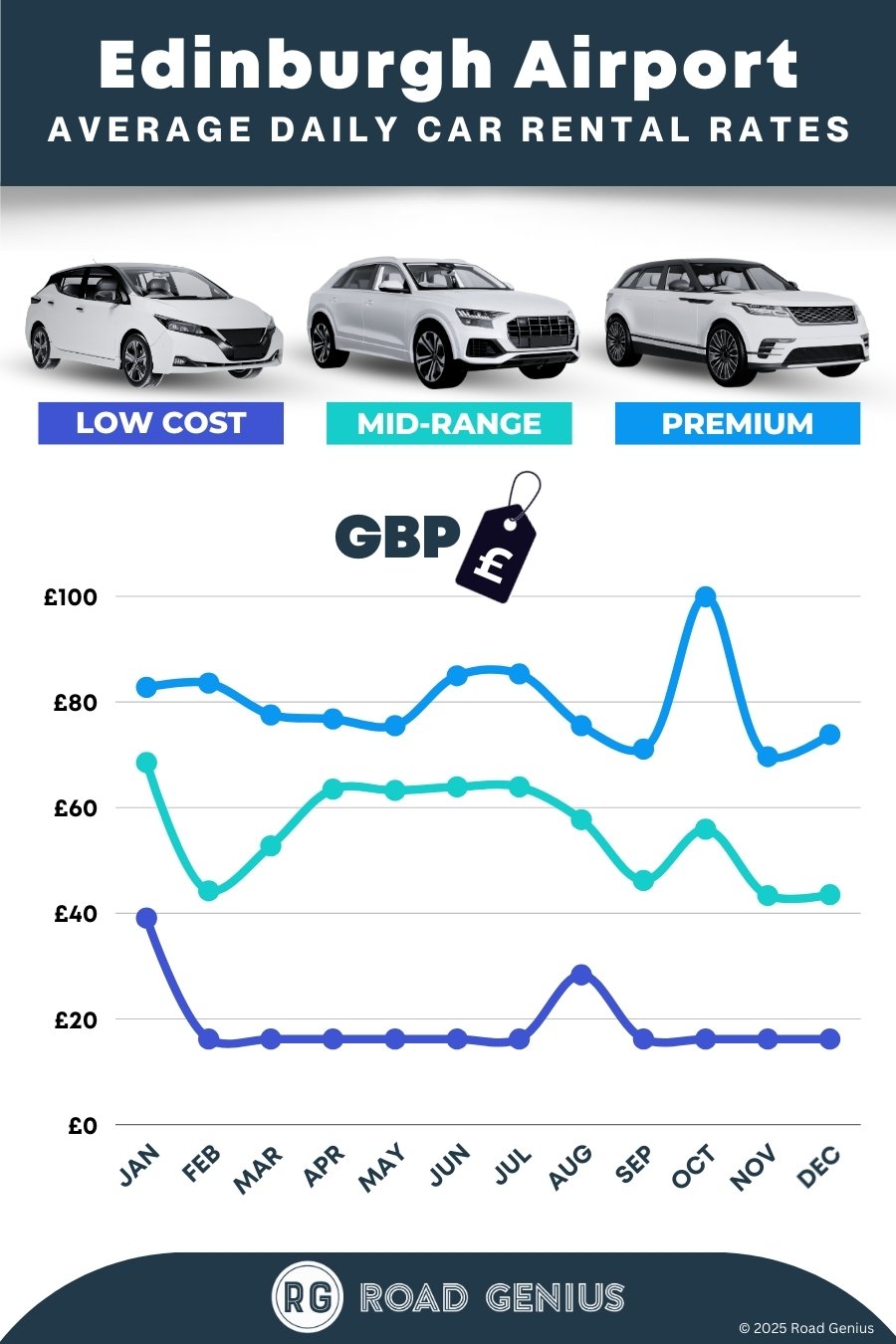 On average, car rentals at Edinburgh Airport cost around €51 per day, with the lowest-priced rentals available from €16 per day.
