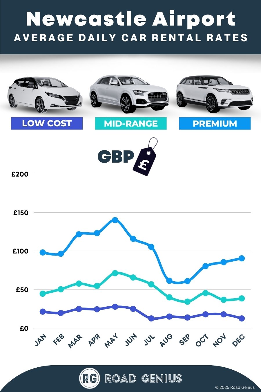 On average, car rentals at Newcastle Airport cost around €55 per day, with the lowest-priced rentals available from €12 per day.