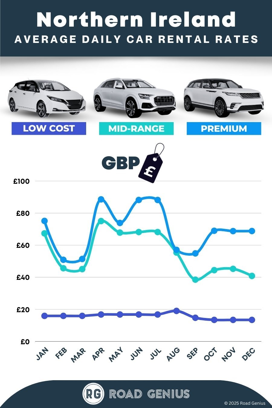 On average, car rentals in Northern Ireland cost around €47 per day, with the lowest-priced rentals available from €13 per day.
