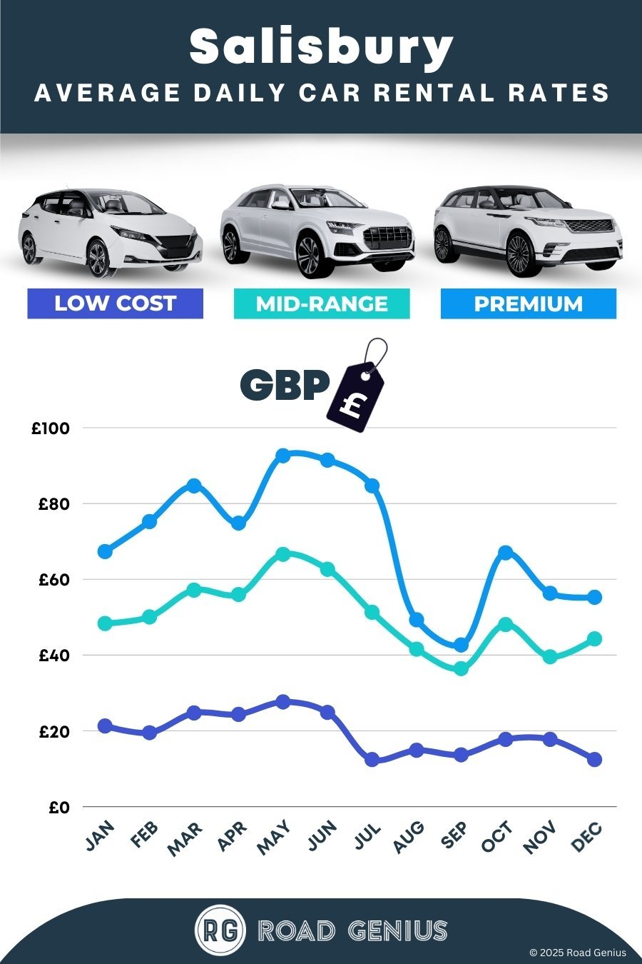 On average, car rentals in Salisbury cost around €47 per day, with the lowest-priced rentals available from €12 per day.