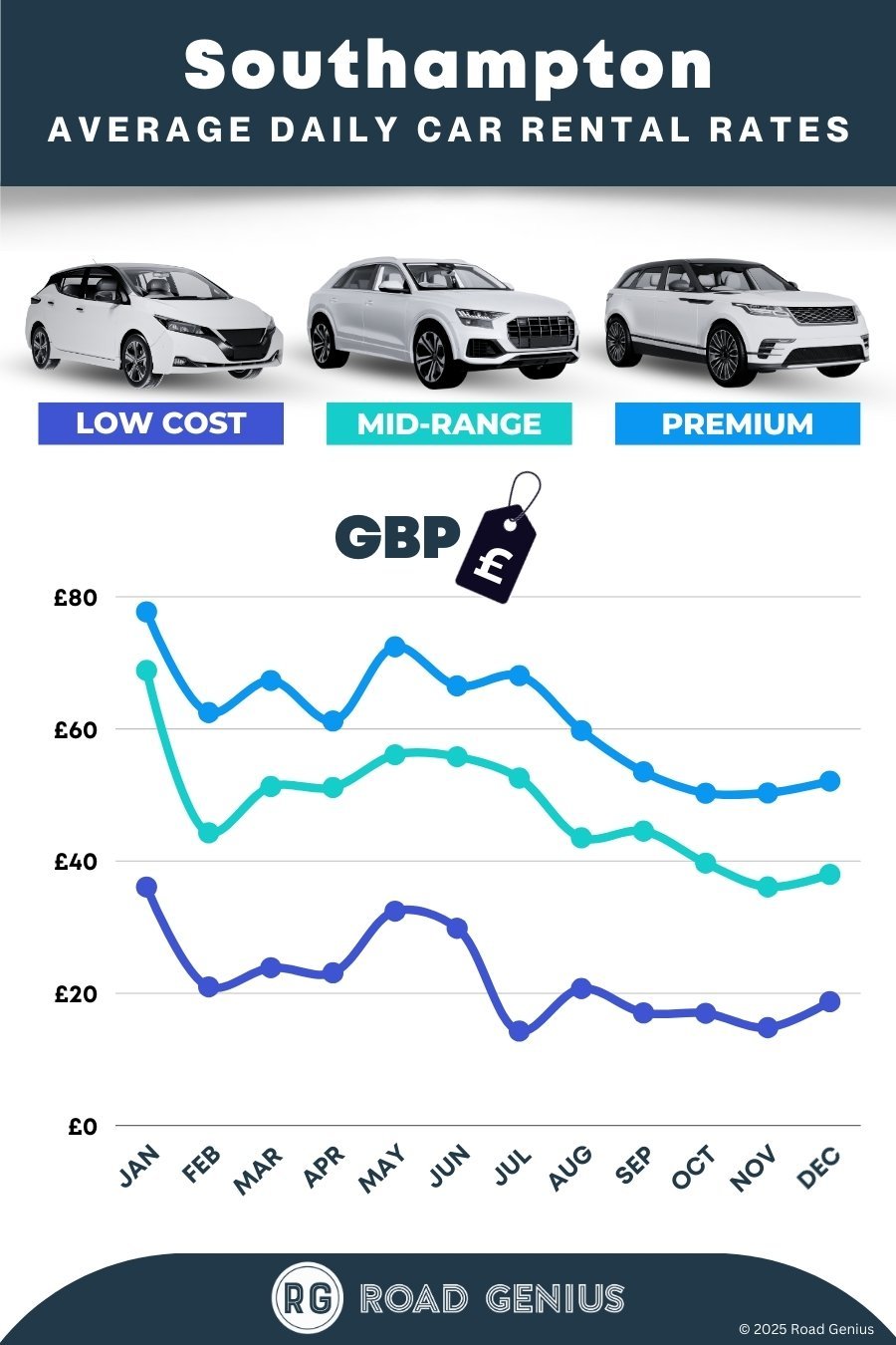 Finding a car rental in Southampton is easier with Road Genius. Compare prices from dozens of suppliers in the UK with no booking fees. Pick up in the city centre, near the cruise terminals or at Southampton Airport, then take the M3 or M27 to London, the New Forest or Portsmouth. Arriving on a cruise day? Book early for summer weekends when demand is high and queues can build around 9 to 10am.