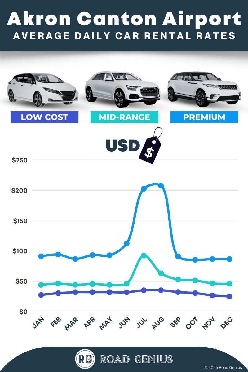 On average, car rentals at Akron Canton Airport cost around $65 per day, with the lowest-priced rentals starting at $25 per day.