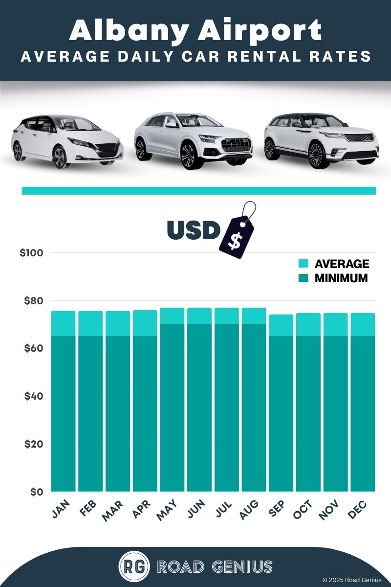 On average, car rentals at Albany Airport cost around $73 per day, with the lowest-priced rentals starting at $65 per day.