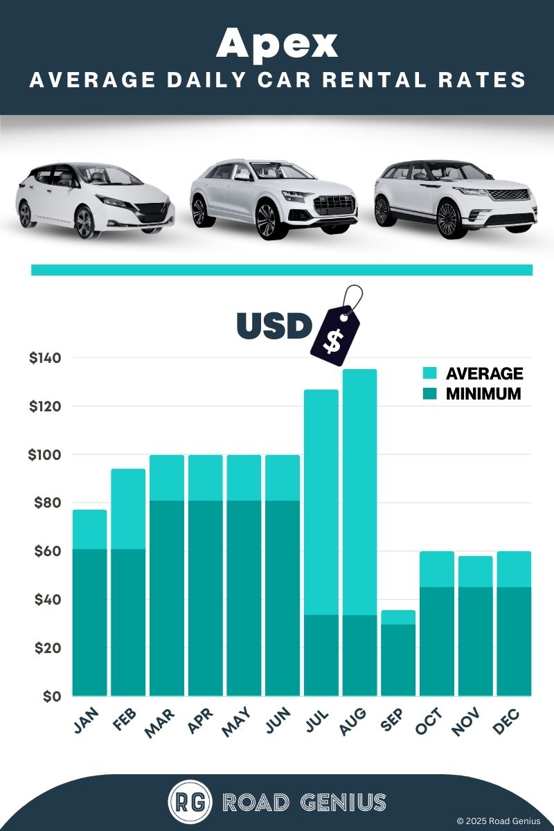On average, car rentals in Apex cost around $76 per day, with the lowest-priced rentals starting at $29 per day.