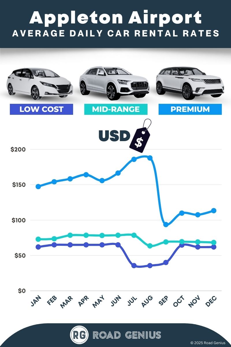 On average, car rentals at Appleton Airport cost around $92 per day, with the lowest-priced rentals starting at $36 per day.