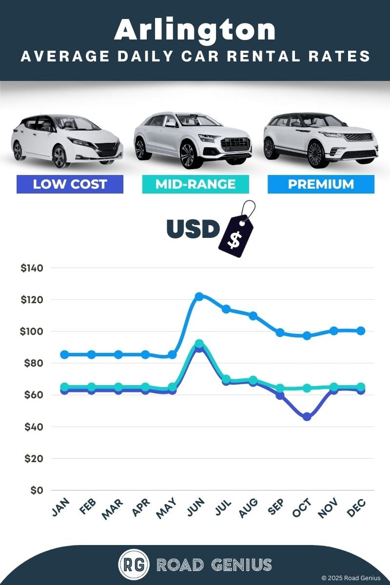 On average, car rentals in Arlington cost around $77 per day, with the lowest-priced rentals starting at $46 per day.