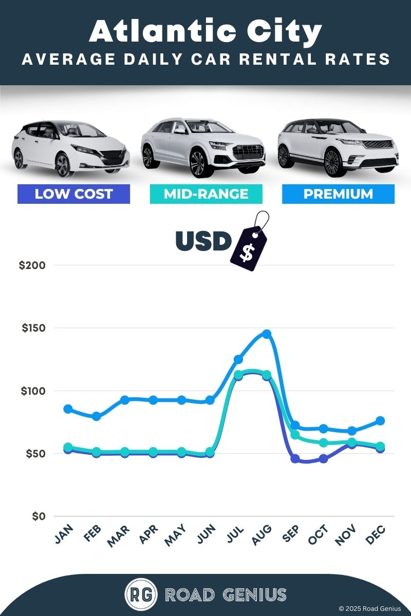 On average, car rentals in Atlantic City cost around $72 per day, with the lowest-priced rentals starting at $46 per day.