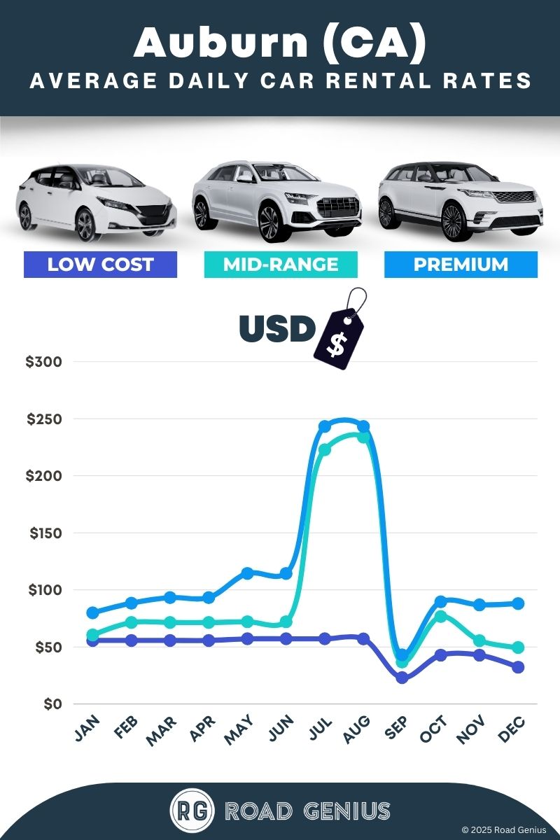 On average, car rentals in Auburn (CA) cost around $85 per day, with the lowest-priced rentals starting at $23 per day.