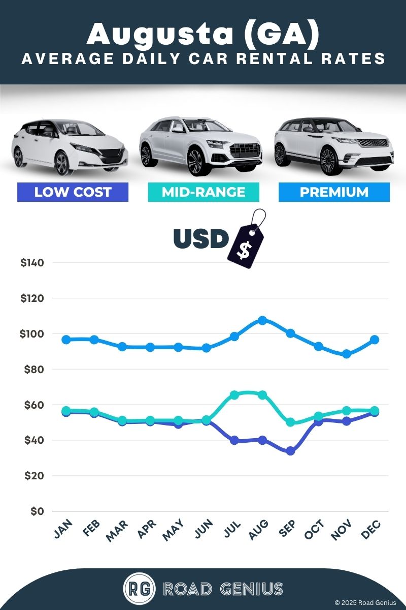 On average, car rentals in Augusta (GA) cost around $66 per day, with the lowest-priced rentals starting at $34 per day.