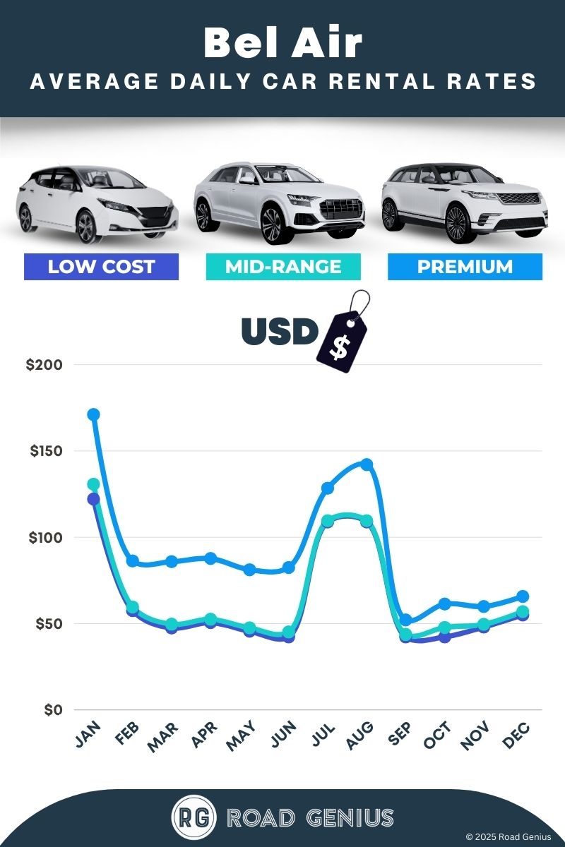 On average, car rentals in Bel Air cost around $74 per day, with the lowest-priced rentals starting at $42 per day.