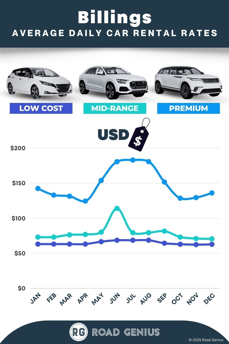 On average, car rentals in Billings cost around $97 per day, with the lowest-priced rentals starting at $62 per day.