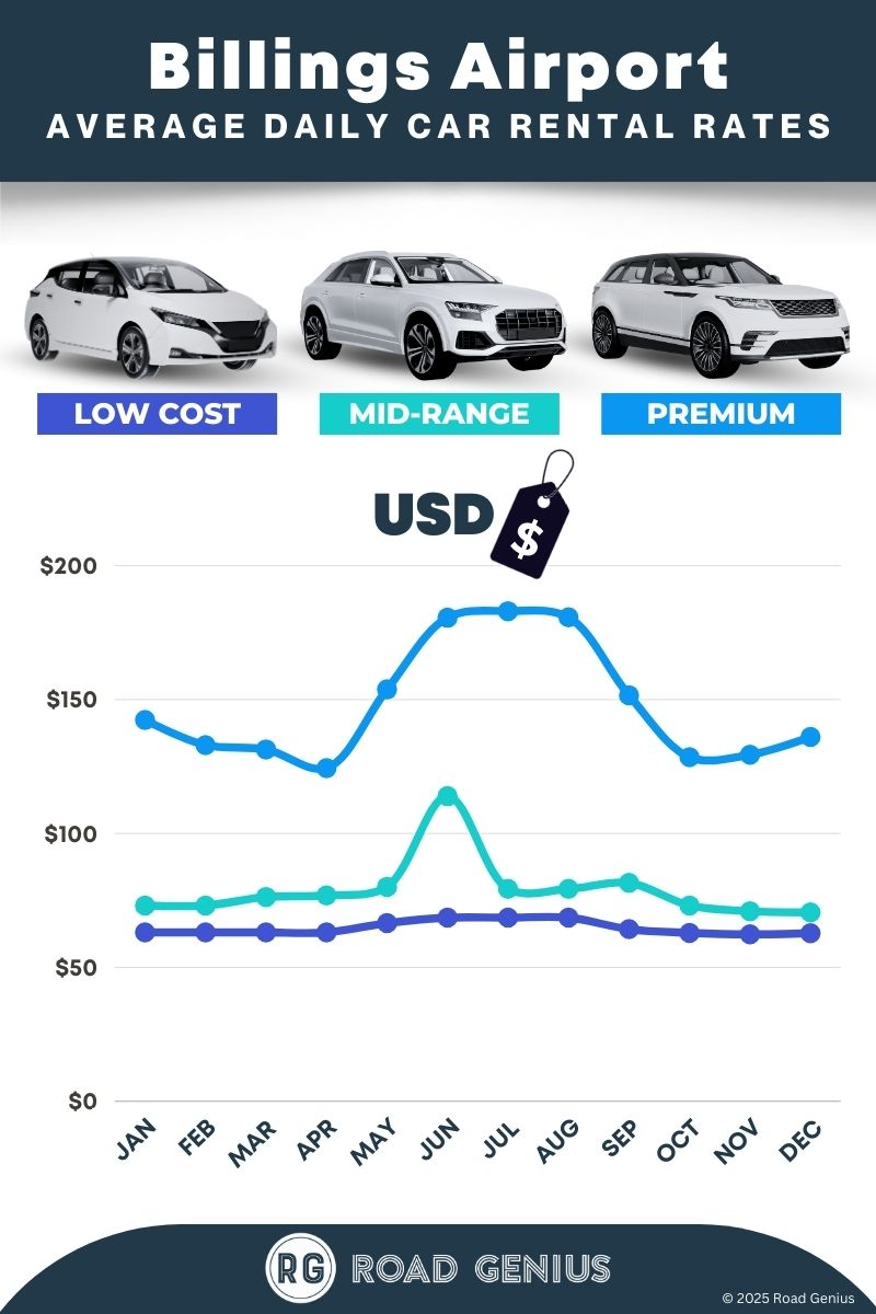 On average, car rentals at Billings Airport cost around $97 per day, with the lowest-priced rentals starting at $62 per day.