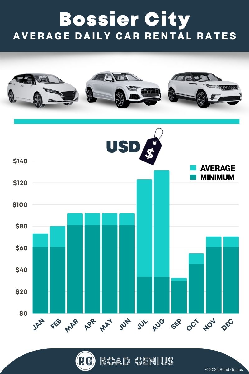 On average, car rentals in Bossier City cost around $74 per day, with the lowest-priced rentals starting at $29 per day.