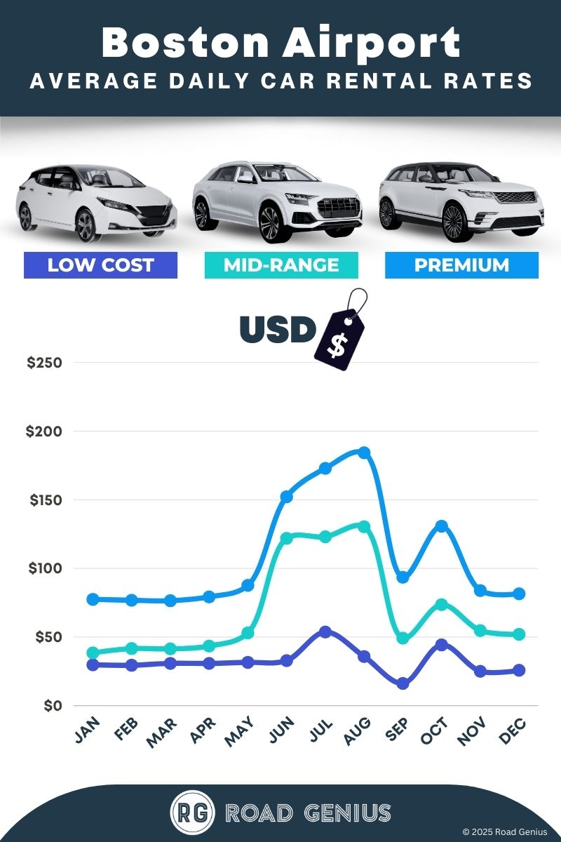 On average, car rentals at Boston Airport cost around $70 per day, with the lowest-priced rentals starting at $16 per day.