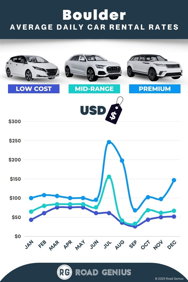 On average, car rentals in Boulder cost around $84 per day, with the lowest-priced rentals starting at $26 per day.