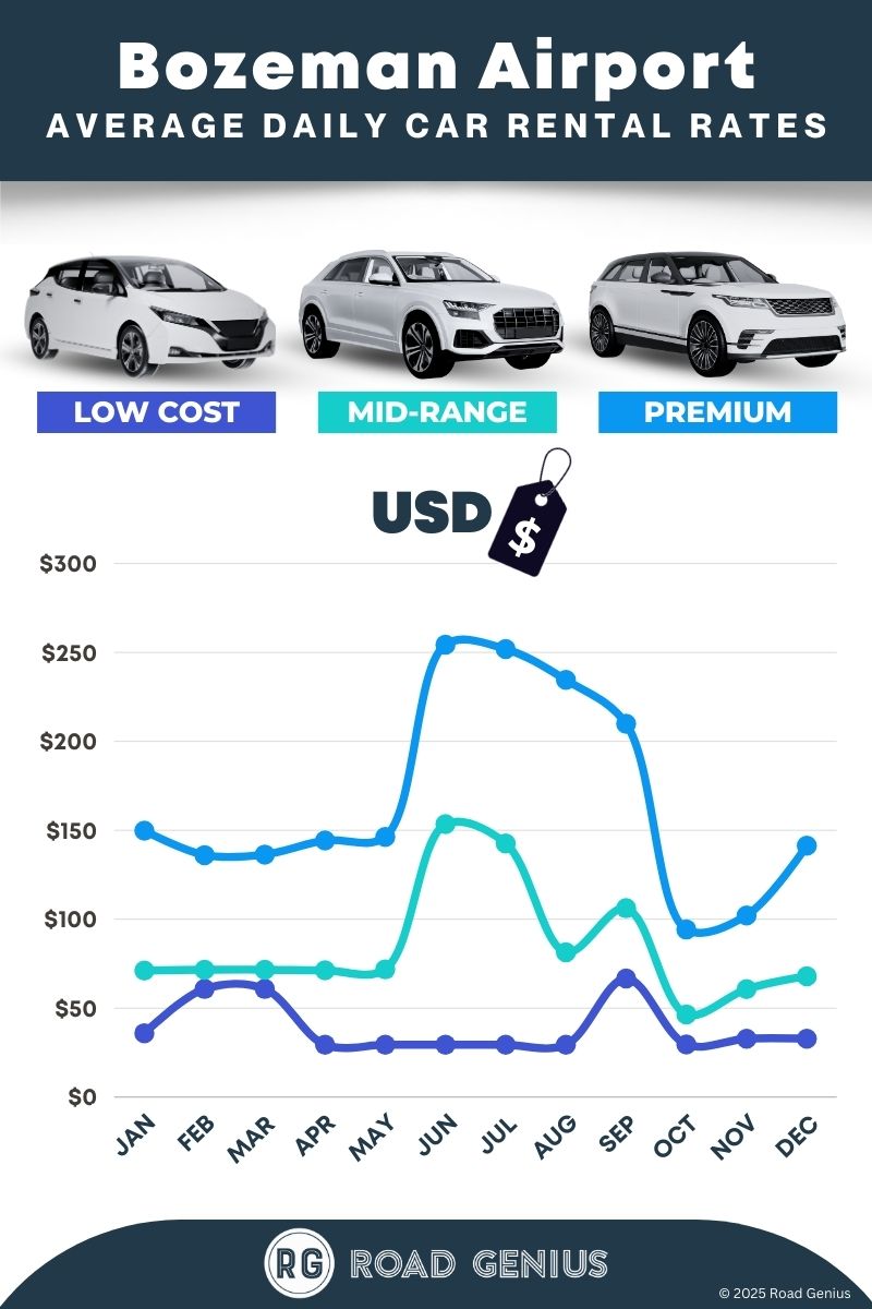 On average, car rentals at Bozeman Airport cost around $97 per day, with the lowest-priced rentals starting at $29 per day.