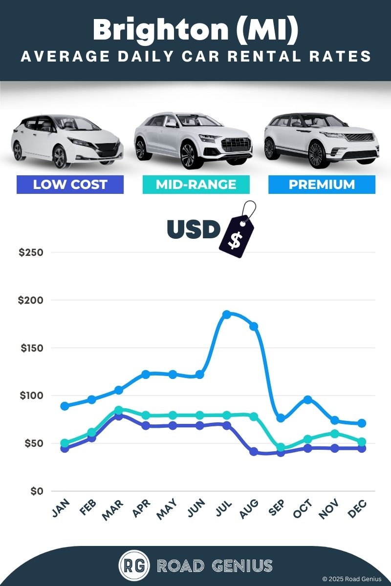 On average, car rentals in Brighton (MI) cost around $78 per day, with the lowest-priced rentals starting at $40 per day.