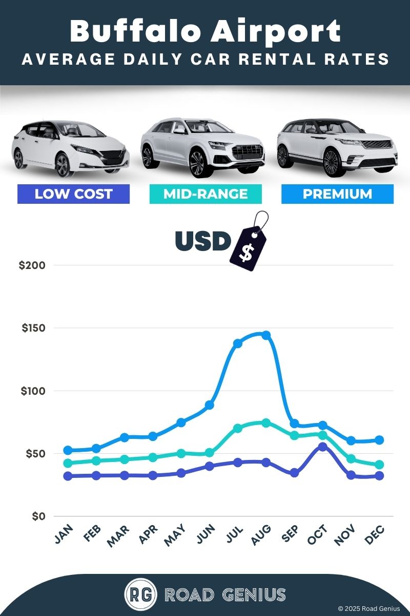 On average, car rentals at Buffalo Airport cost around $56 per day, with the lowest-priced rentals starting at $32 per day.