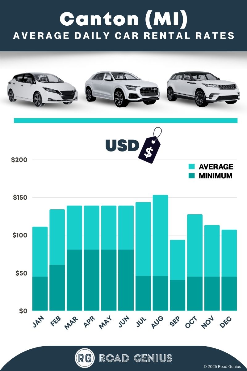 On average, car rentals in Canton (MI) cost around $86 per day, with the lowest-priced rentals starting at $40 per day.