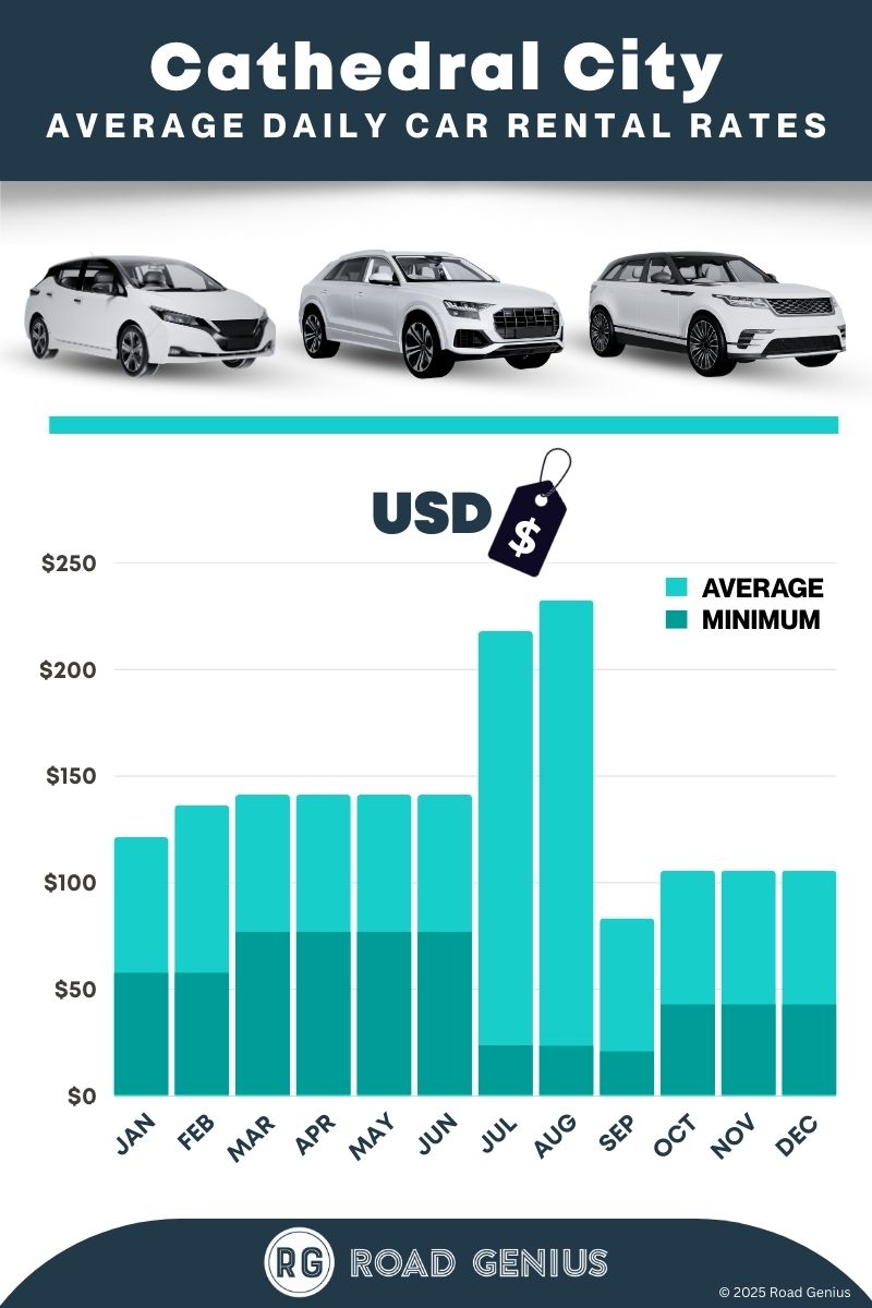 On average, car rentals in Cathedral City cost around $130 per day, with the lowest-priced rentals starting at $20 per day.